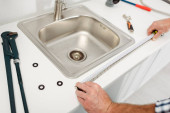 Widok z góry hydraulik w odzieży roboczej mocowanie zlewozmywak w pobliżu narzędzi na podłodze