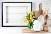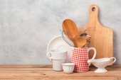 Puste miejsce na koncepcję kuchennego banera. Tło kuchenne do makiety z łyżeczką, czajniczek, kubki, wałek, miski na drewnianym stole, białe tło.