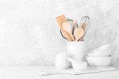 Zdjęcie "Puste miejsce na koncepcję kuchennego banera. Tło kuchenne do makiety z łyżeczką, czajniczek, kubki, wałek, miski na drewnianym stole, białe tło." może być wykorzystywane do celów osobistych i komercyjnych zgodnie z warunkami zakupionej licencji Royalty-free. Obraz jest dostępny do pobrania w jakości wysokiej rozdzielczości do 5760x3840.