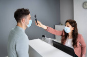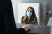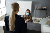 Sklep Kasjer w sklepie lub recepcja hotelu z maską medyczną