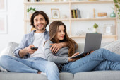 Zdjęcie "Kobieta pokazująca zawartość męża na tablecie cyfrowym, wnętrze domu" może być wykorzystywane do celów osobistych i komercyjnych zgodnie z warunkami zakupionej licencji Royalty-free. Obraz jest dostępny do pobrania w jakości wysokiej rozdzielczości do 5760x3840.