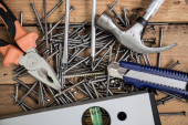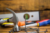 Narzędzia do pracy na drewnianym tle, miejsce na tekst. Jest młotek, szczypce i inne narzędzia
