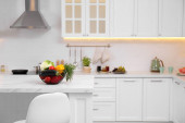 Kuchnia licznik z zestawem naczyń, naczynia i piękny bukiet. Projekt wnętrza