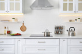 Zdjęcie "Kuchnia licznik z zestawem naczyń, naczynia i piękny bukiet. Projekt wnętrza" może być wykorzystywane do celów osobistych i komercyjnych zgodnie z warunkami zakupionej licencji Royalty-free. Obraz jest dostępny do pobrania w jakości wysokiej rozdzielczości do 5760x3840.