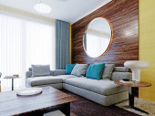 Nowo zaprojektowany salon z nowoczesnymi meblami ściennymi z telewizorem i narożną, szarą sofą ze stolikiem kawowym. Wnętrze apartamentu z żółtymi ścianami i drewnianymi panelami z okrągłym lustrem. Renderowanie 3D.