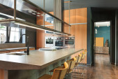 Zdjęcie "Żółte wnętrze kuchni z dużym okrągłym lustrem na ścianie i współczesnymi meblami wykonanymi z drewnianych i stalowych fasad mebli. Renderowanie 3D." może być wykorzystywane do celów osobistych i komercyjnych zgodnie z warunkami zakupionej licencji Royalty-free. Obraz jest dostępny do pobrania w jakości wysokiej rozdzielczości do 5760x3840.