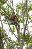 Portret arborysty trzyma na drzewie ręczną piłą z czystym tłem nieba