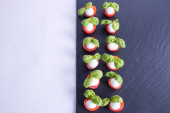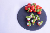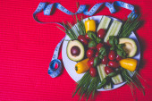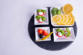 talerz z warzywami stoi na niebieskim tle z matowym dotykiem