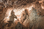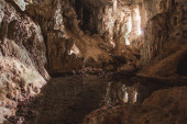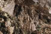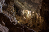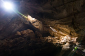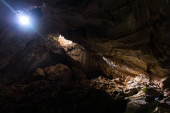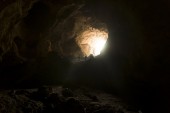 cień człowieka stojącego u ujścia jaskini Nam Thiang, dystrykt Khammouane, Laos.