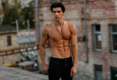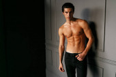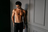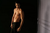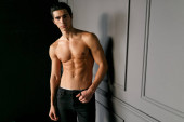 Profil portretu młodego mężczyzny bez koszulki z opaloną skórą, na czarnym tle. Miejsce na tekst.