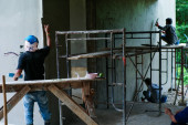 Zbliżenie stosu zbrojenia stalowni na ziemi na placu budowy z rozmazanymi pracownikami niosącymi wiadro mieszanego cementu