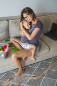 Młoda matka z uroczym synkiem dobrze się bawi w jasnym, przytulnym salonie