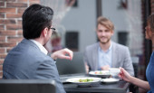 Szczęśliwa para siedzi na zewnątrz na tarasie restauracja, jedzenie.
