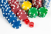 As gra w karty z czerwonymi kośćmi. Koncepcja zakładów i gier hazardowych oraz żetony pokerowe.