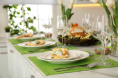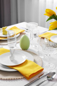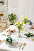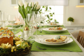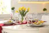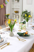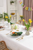 Świąteczny stół wielkanocny z kwiatowym wystrojem w kuchni