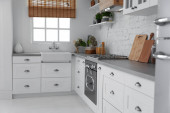 Zdjęcie "Eleganckie wnętrza kuchni z białym okrągłym stołem" może być wykorzystywane do celów osobistych i komercyjnych zgodnie z warunkami zakupionej licencji Royalty-free. Obraz jest dostępny do pobrania w jakości wysokiej rozdzielczości do 5760x3840.