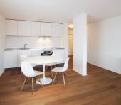 Nowa stylowa, jasna kuchnia z białymi szafkami. Przestronne, nowoczesne wnętrze z drewnianą podłogą, białym stołem, krzesłami przemysłowymi i dużym oknem sufitowym.