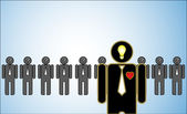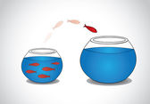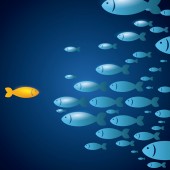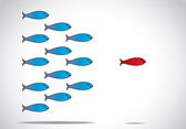 A sharp smart alert happy red fish with open eyes going in the opposite direction of a group of sad blue fishes with closed eyes : Be different or unique concept design illustration