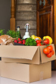 Skrzynka darowizn z owocami i warzywami. Dzielenie się koncepcją jedzenia. Dostawa żywności Wolontariusz zbieranie żywności. Pandemia koronawirusów pomaga. Widok z góry