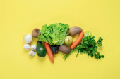 Baner letni, owoce cytrusowe, grejpfrut, pomarańcza, cytryna, banany na żółtym tle, koncepcja minimalnej diety, zdrowe i naturalne jedzenie, klacz płaska, usługa dostawy do domu.
