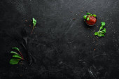 Asortyment przypraw, ziół i zieleni. Składniki do gotowania. Tło żywnościowe. Czarny kamienny stół, Kopiuj miejsce na tekst. Widok z góry.