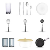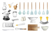 Zestaw różnych przyborów kuchennych i naczyń na białym tle