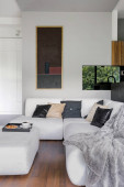 Elegancka, biała sypialnia z dużym łóżkiem, sztuką i oknem sufitowym