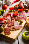 Kiełbasy wieprzowe peklowane i wołowe serwowane jako tapas lub antipasto w formie bufetu na zimno