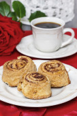 cynamon rolkach na białym talerzu wśród płatków róż