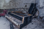 stare pianino z widokiem na krzesło z ciemnymi chmurami