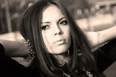 Młoda nowoczesna dziewczyna w mieście, życie studenckie, prosta dziewczyna na zewnątrz portret