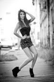 Młoda nowoczesna dziewczyna w mieście, życie studenckie, prosta dziewczyna na zewnątrz portret
