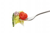 widelec, sałata, pomidory, ogórki i papryka w misce na tle