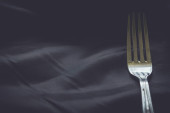 Organiczne jajko pół z widelcem na górze umieszczone na kamiennym tle teksturowanym. Zdrowe i naturalne pełne białek jedzenie serwowane na śniadanie