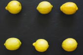Grupa jasnożółte cytryny w prawym górnym rogu na czarnym tle z miejsca do kopiowania. Świeże tropikalne owoce cytrusowe pełne witamin na ciemnym łupku