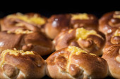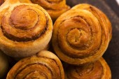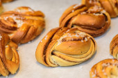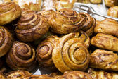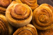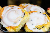 Świeżo upieczone domowe angielskie bułki cynamonowe wystawione na sprzedaż w kawiarni w Londynie, wybiórcze skupienie