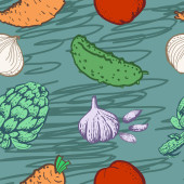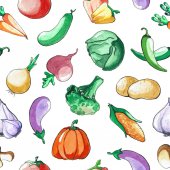 Płynny akwarela ręcznie rysowane wzór z rolników organicznych naturalnych dojrzałych warzyw. Pomarańczowa marchewka, zielona cukinia. Koperkowe zioła, czerwona fioletowa cebula. Wegetariańskie wegańskie wzornictwo etykiety menu tekstylne