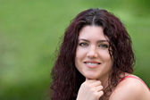 piękne młode rude kobieta uśmiechając się i trzyma ręce w jej włosy