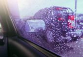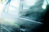 Zbliżenie niebieskiego samochodu w myjni ręcznej