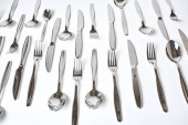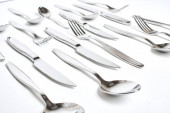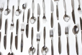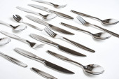 zestaw błyszczących sztućców na białym tle, widok z bliska