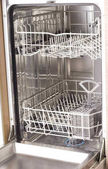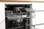 widok z bliska na otwartą zmywarkę w nowoczesnym wnętrzu kuchni
