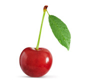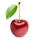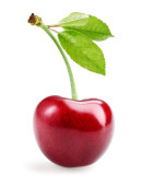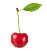 czerwona wiśnia z zielonym liściem na białym tle. Ścieżka wycinania