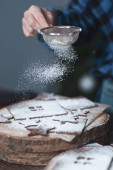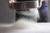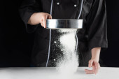 ciemne tło piekarze ręce przesiewać białą mąkę pszenną na sicie nad