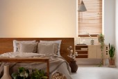 Zdjęcie "Stylowe wnętrze pokoju z miejscem pracy i łóżkiem" może być wykorzystywane do celów osobistych i komercyjnych zgodnie z warunkami zakupionej licencji Royalty-free. Obraz jest dostępny do pobrania w jakości wysokiej rozdzielczości do 5760x3840.