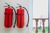 Gaśnica w pobliżu białej ściany wewnątrz. Miejsce na tekst