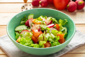 Zdjęcie "Świeża sałatka warzywna z oliwą z oliwek w ceramicznej misce na drewnianym tle. Sezonowe letnie danie z pomidorów, ogórków i rzodkiewek." może być wykorzystywane do celów osobistych i komercyjnych zgodnie z warunkami zakupionej licencji Royalty-free. Obraz jest dostępny do pobrania w jakości wysokiej rozdzielczości do 5760x3840.