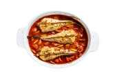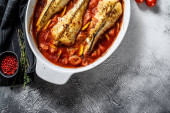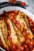 Zdjęcie "Monkfish pieczone w pomidorach w naczyniu do pieczenia. Czarne tło. Widok z góry." może być wykorzystywane do celów osobistych i komercyjnych zgodnie z warunkami zakupionej licencji Royalty-free. Obraz jest dostępny do pobrania w jakości wysokiej rozdzielczości do 5760x3840.