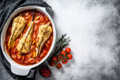 Monkfish pieczone w pomidorach w naczyniu do pieczenia. Czarne tło. Widok z góry.