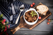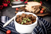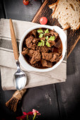 Gulasz wołowy w ceramicznym garnku. Skupienie selektywne.