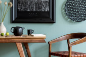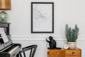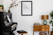 Stylowa kompozycja we wnętrzu salonu z czarnym fortepianem, makieta na mapie plakatu, suszone kwiaty w wazonie, dekoracja i eleganckie akcesoria presonalne w nowoczesnym wystroju wnętrz.